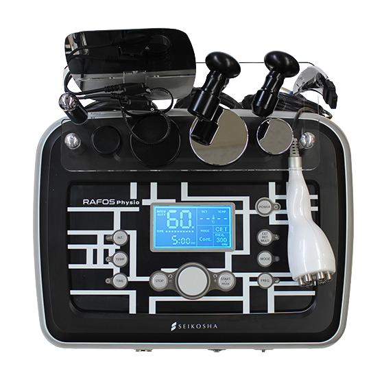 RAFOSにL字型のプローブが標準セットとなっており、フィジオセラピーの稼働しながらの施術や施術者が温度を手で確認しながら安全効果的にできます。
